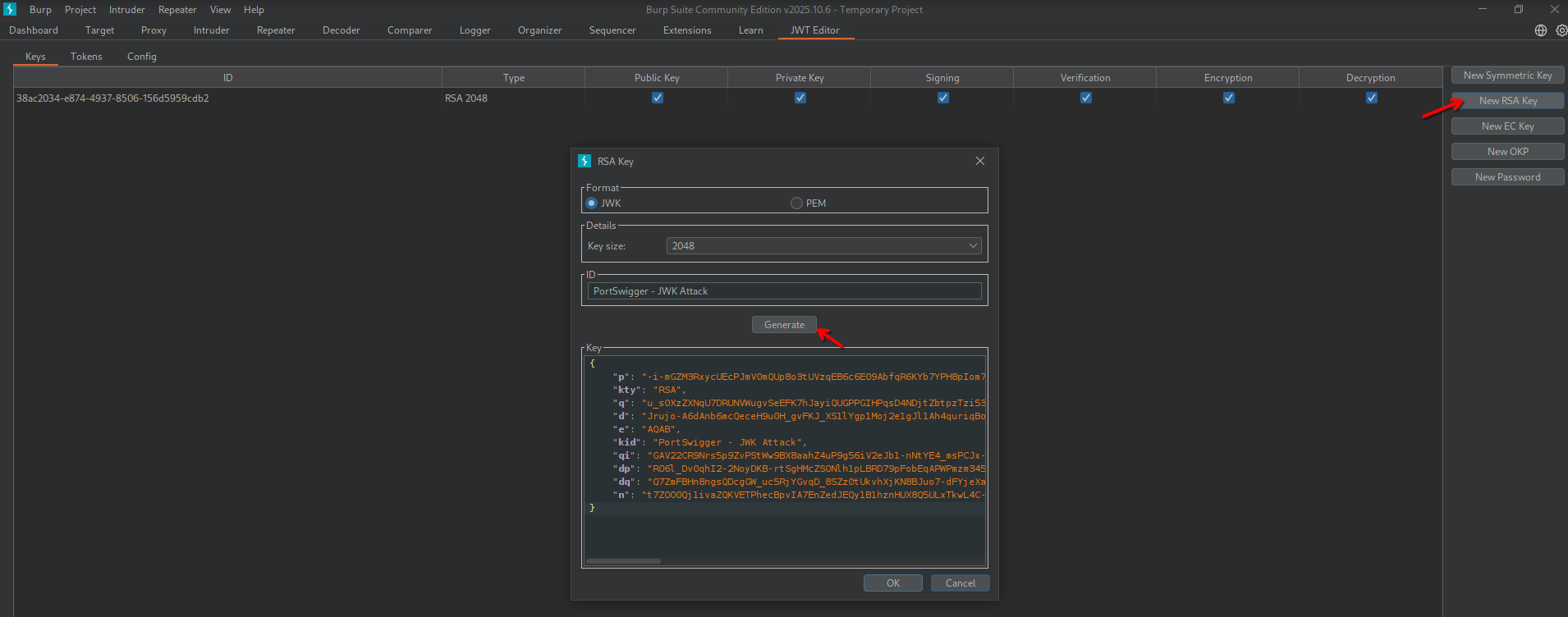 In the “Keys” tab in JWT Editor, select New RSA Key (adjust format and key size if needed) > Generate > Ok.