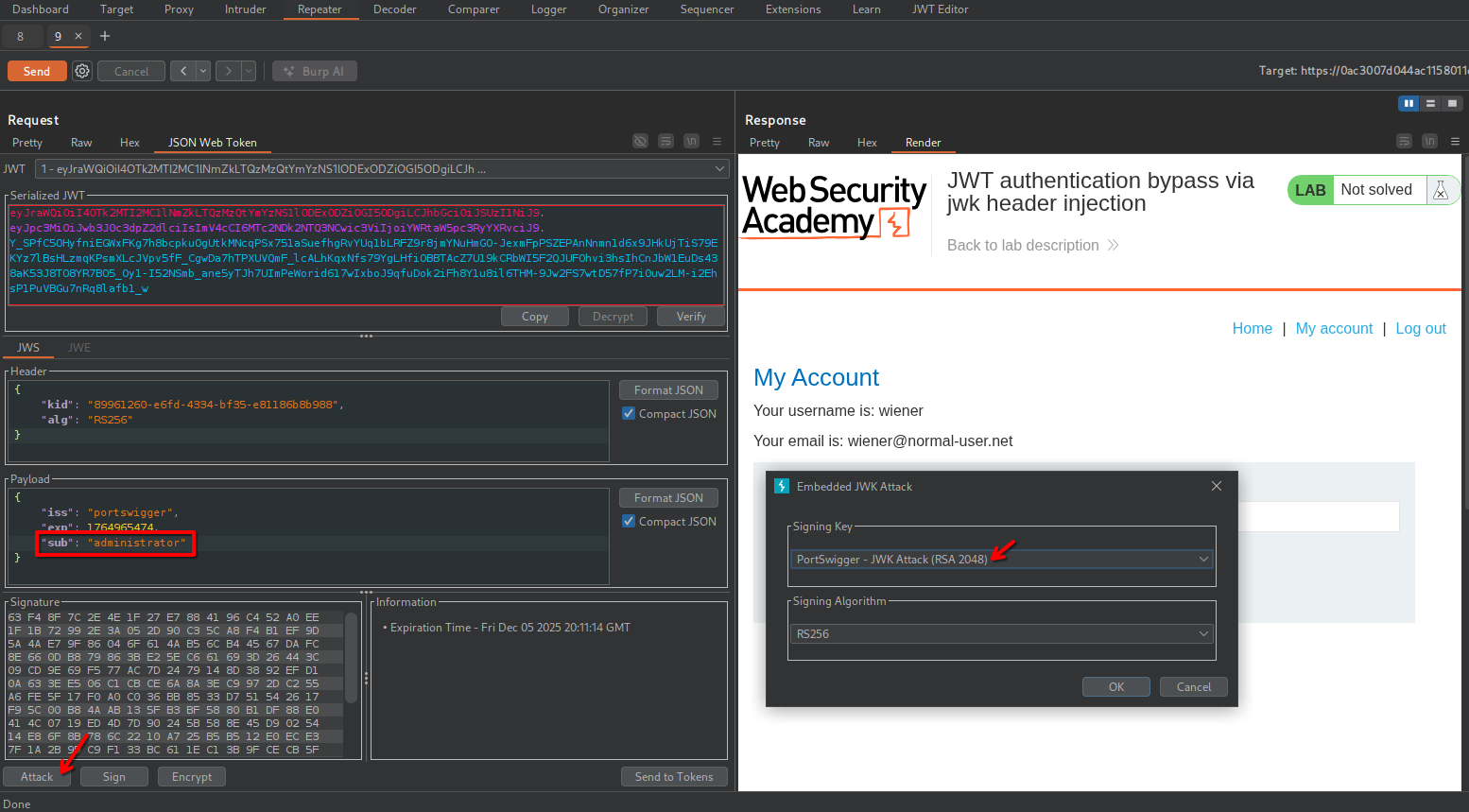 In the “JSON Web Token” tab in Repeater, modify the payload as needed (in my case I changed the sub field to impersonate the administrator), then Attack > Embedded JWK. Select the correct signing key and and algorithm and click Ok.