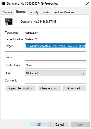 The first binary invoked is C:\Windows\System32\cONhosT.exe, properly mispelled to evade detection. Conhost stands for “Console Window Host” and is most commonly known as cmd.exe. Indeed, it will open a command prompt window.