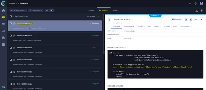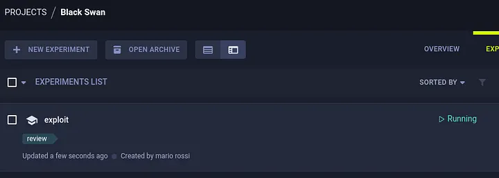 When the exploit script asks for the project name, it is necessary to enter “Black Swan”. Also note that when you upload a new task, it is marked as “review” (tagged by the exploit itself when uploading it to ClearML).